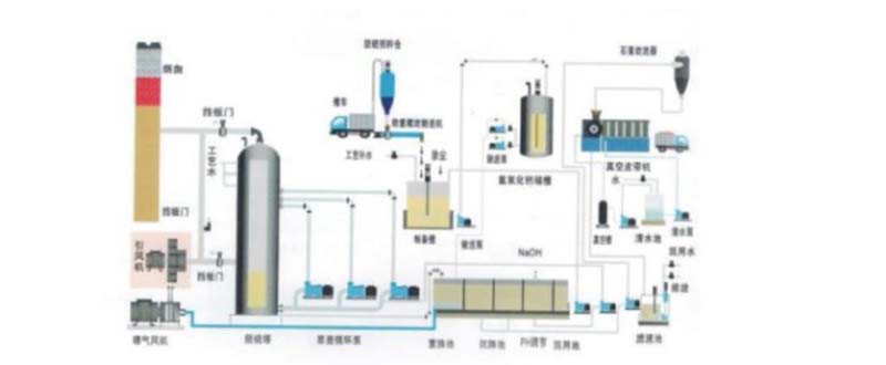 雙堿法脫硫工藝,簡稱雙堿法,是較常用的煙氣脫硫法。鈉鈣雙堿法采用火堿吸收SOz,石灰還原再生。再生后吸收劑循環使用,無廢水排放。窯爐煙氣經除塵器除塵后進入脫硫塔,并與脫硫液中的堿性脫硫劑在霧化區內充分接觸反應,完成煙氣的脫硫吸收。